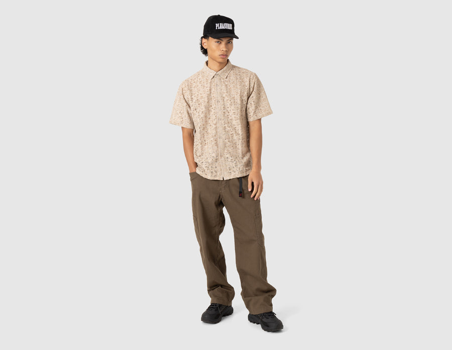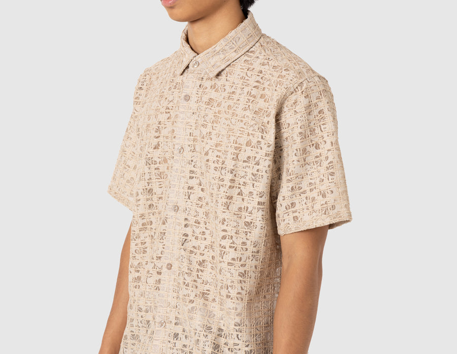 The Pleasures Lacy Button Down introduces a fusion of style and comfort that's sure to elevate your wardrobe game. Crafted with a textural lace fabric base, its relaxed flat collar and button-down front exude laid-back vibes. The iconic Pleasures logo adds a touch of attitude, while the high-quality materials ensure lasting comfort. The Pleasures Lacy Button Down features simplistic lace details embodying the essence of contemporary fashion.